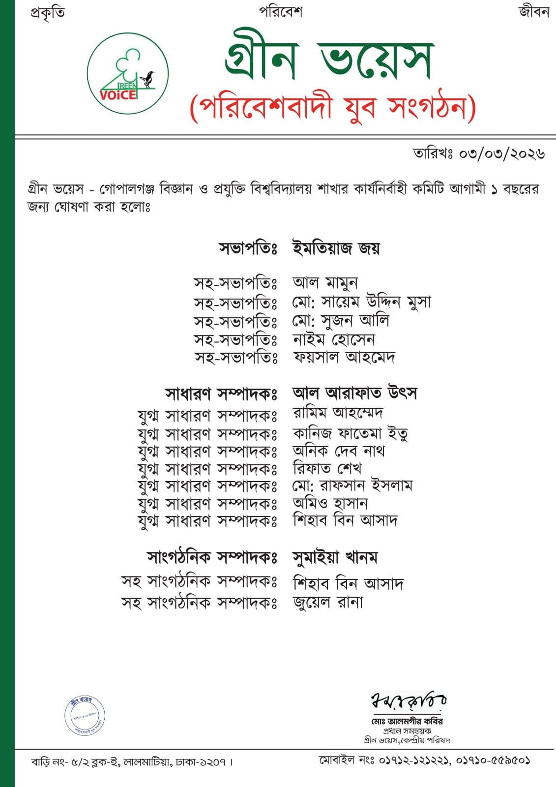 সেই গোপালগঞ্জের সেরা বিদ্যাপীঠ, গোপালগঞ্জ বিজ্ঞান ও প্রযুক্তি বিশ্ববিদ্যালয়ে দেশব্যাপী সবুজায়নের সাথে সাথে মানবিক মানুষ গড়বার প্রত্যয় বহনকারী সংগঠন, দেশের বৃহৎ পরিবেশবাদী যুব সংগঠন, গ্রীন ভয়েসের কার্যকারিতা প্রসারের লক্ষ্যে ও সাংগঠনিক কর্মকাণ্ডে নতুনত্বের নৈপুণ্যতা আনায়নে কেন্দ্রীয় পরিষদের সম্মতিতে আজ পূর্ণাঙ্গ কমিটি অনুমোদন করা হলো।